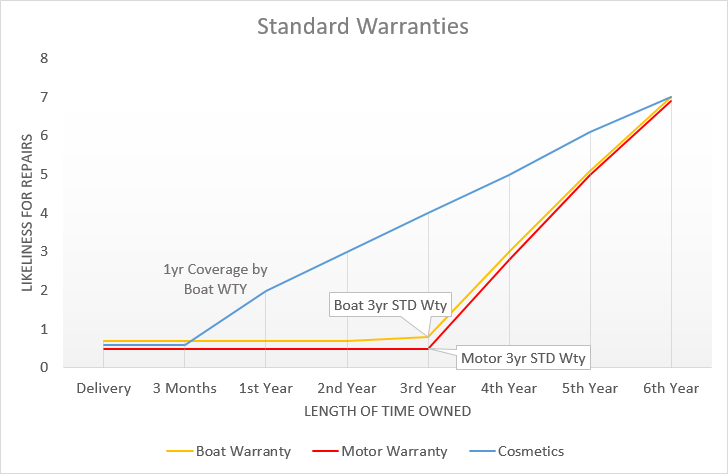 This chart illustrates how the likelihood of repair costs increases as your boat ages—especially after standard factory warranties expire. While most factory warranties provide limited coverage in the early years, the risk of mechanical and cosmetic issues rises significantly over time, highlighting the importance of extended warranty protection to avoid costly out-of-pocket repairs.