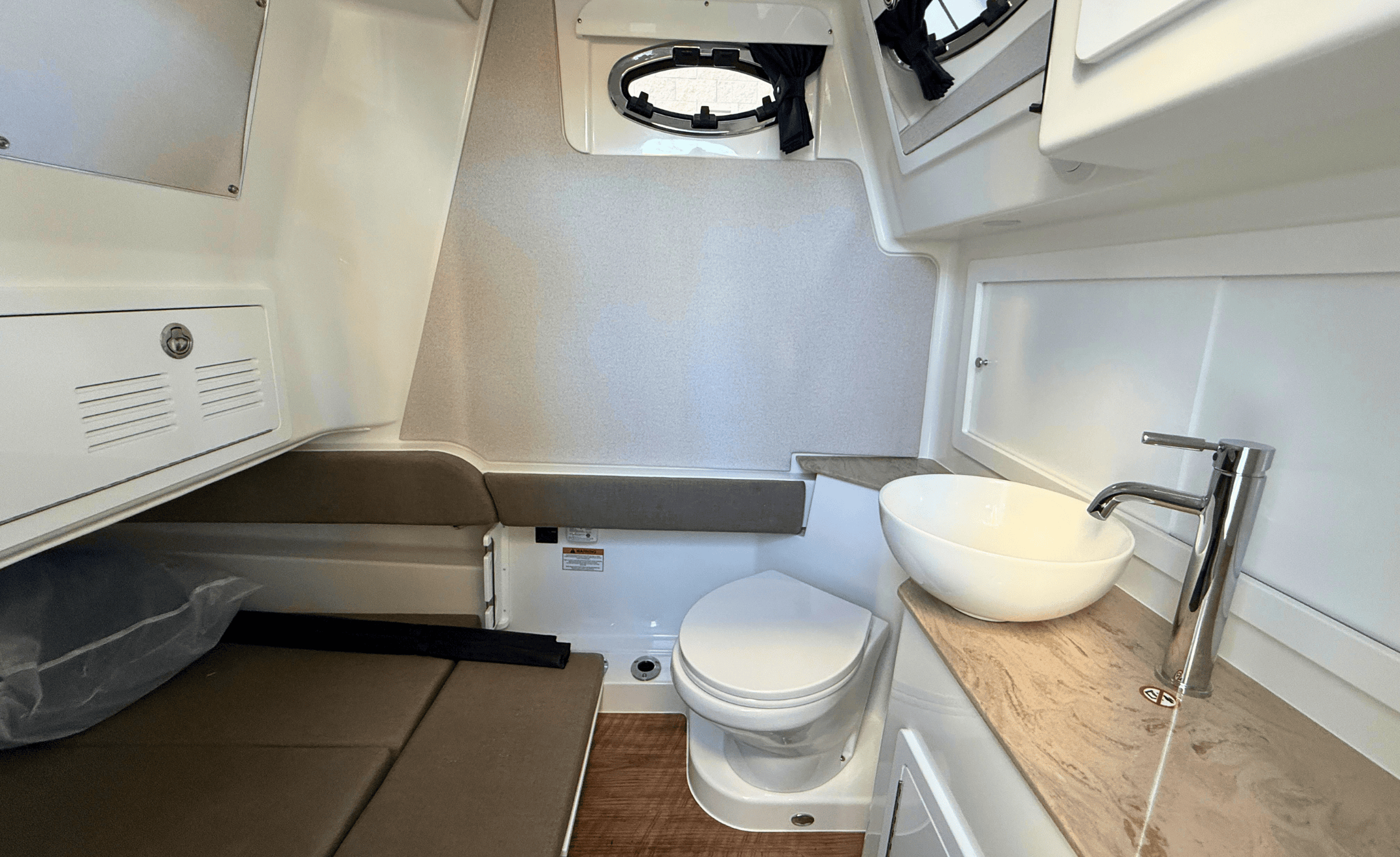 Optional cabin with stand-up head, freshwater tank, and berthing accommodations