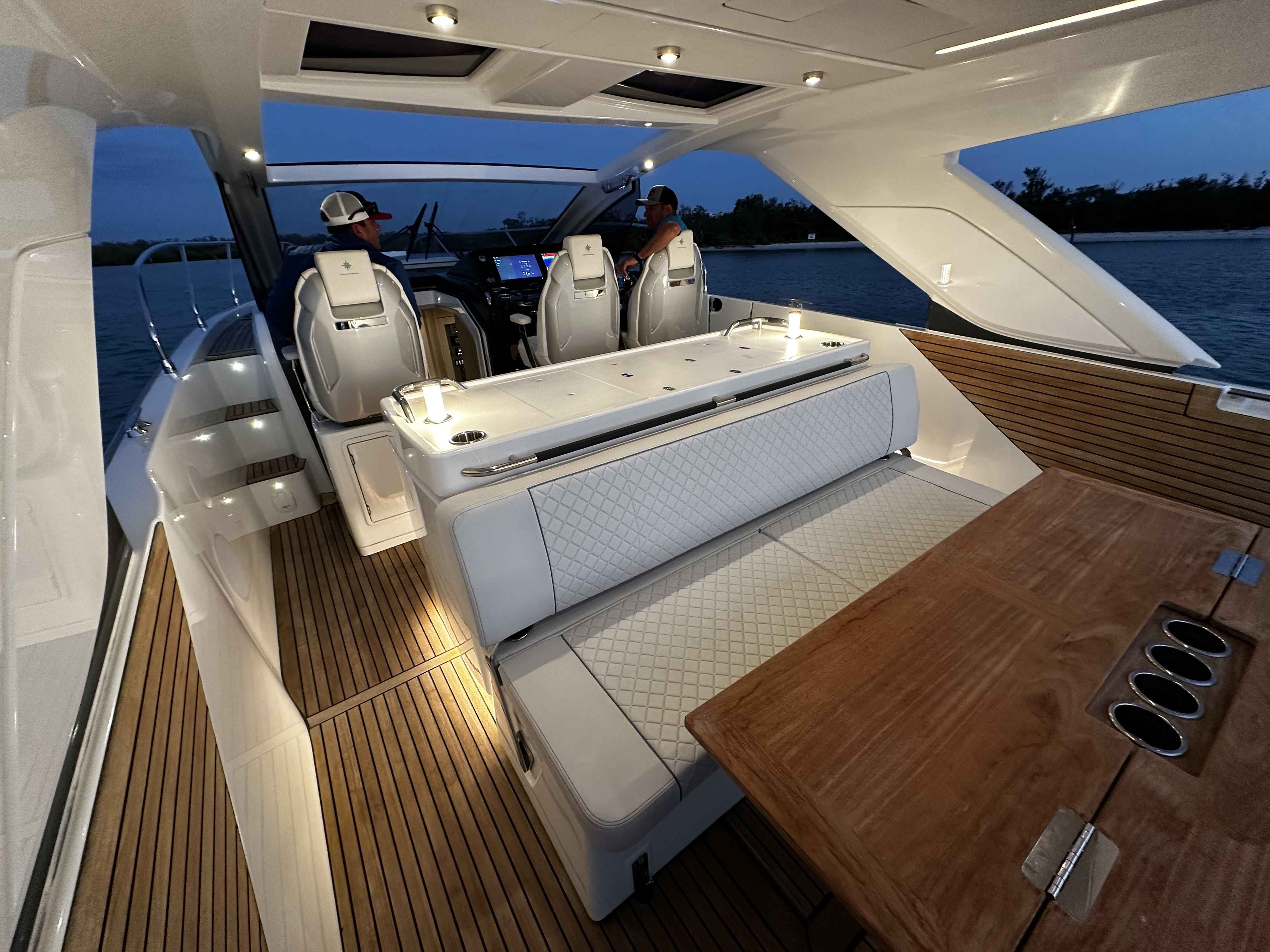 One of the most impressive features of the DB/43 is its open-air entertainment layout. The expansive cockpit is designed for socializing and comfort, equipped with exterior cockpit air conditioning, a second cockpit refrigerator, wood cockpit flooring, and a SureShade electric aft sun awning. Multicolor underwater lights add ambiance for evening entertaining, while the forward cockpit lounge area offers additional seating and a convertible table for relaxing at anchor.
