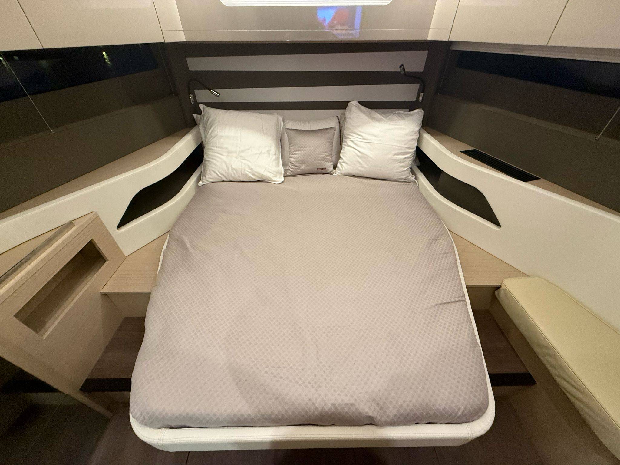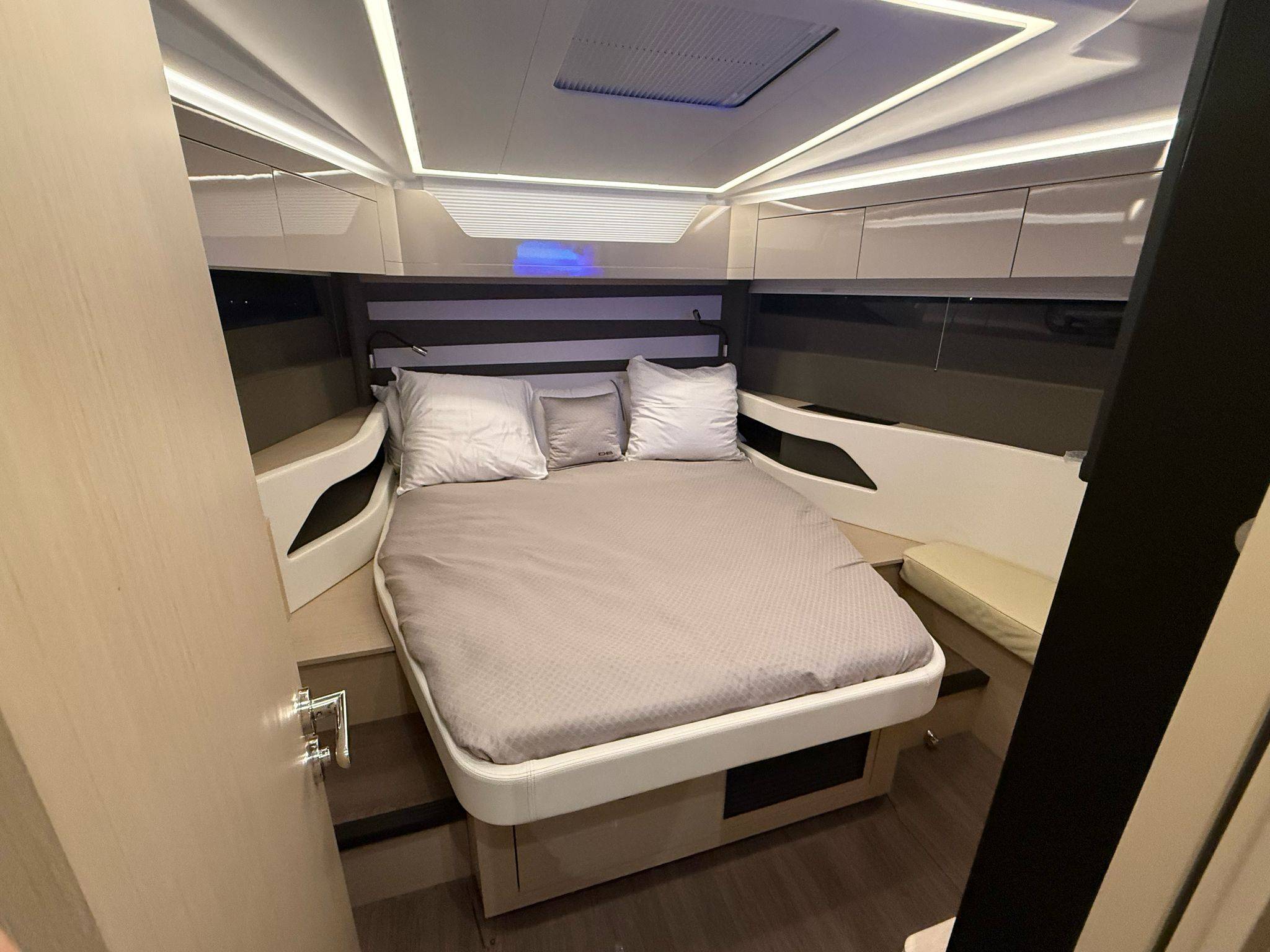 Below deck, the DB/43 features a 2 cabin / 2 head layout finished in elegant White Oak, providing spacious overnight accommodations for family and guests. Both cabins include double berths, and the boat is equipped with a premium Mona Lison bedding package including pillows, comforters, and bed covers. Each head includes a macerator system for added convenience during extended cruising.