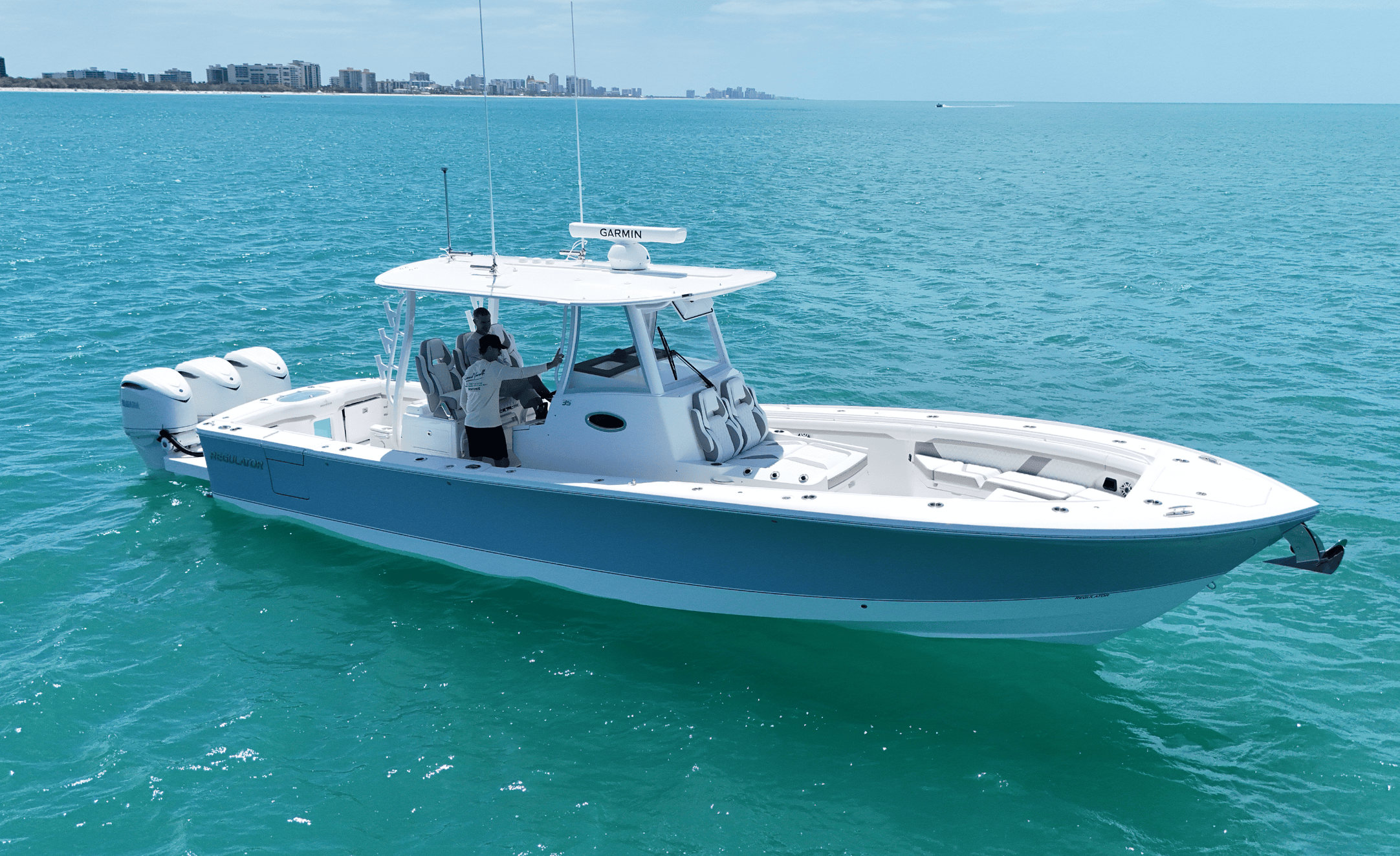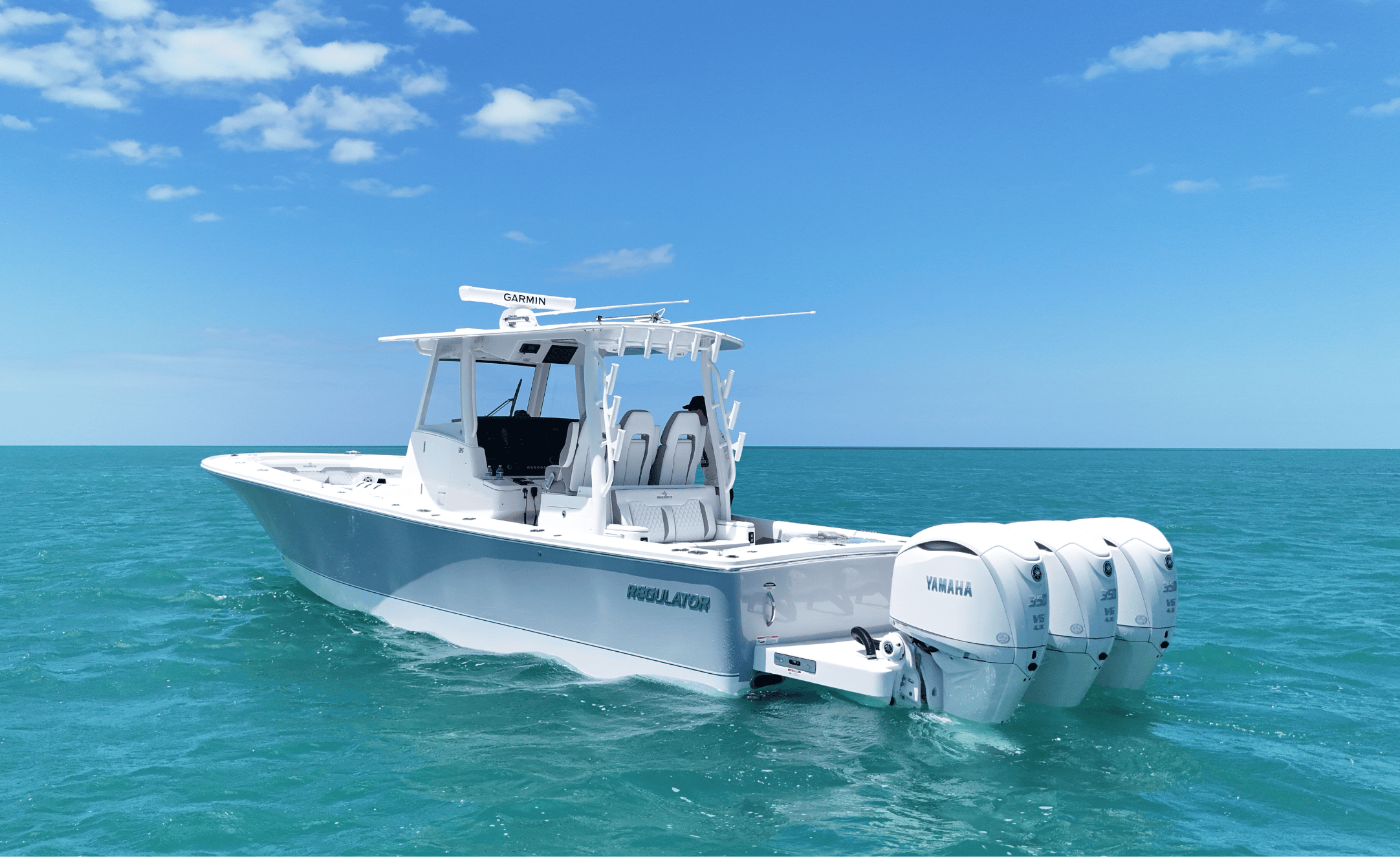 Powered by triple Yamaha outboards (commonly triple Yamaha F350 HP engines), the Regulator 35 brings serious horsepower and efficiency to every trip.